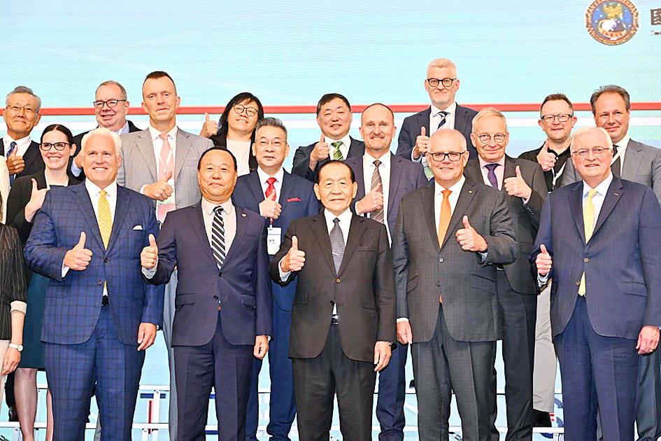 Front row, from left, American Conservative Union chairman Matthew Schlapp, Deputy Minister of Defense Alex Po, Institute for National Defense and Security Research chairman Huo Shou-ye and former Australian prime minister Scott Morrison pose for a photograph with other participants of the Taipei Security Dialogue in Taipei yesterday.