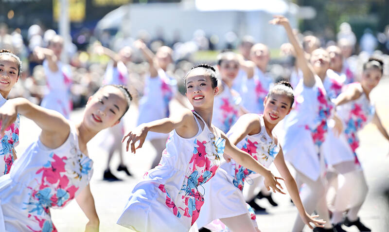 Students from Shin Min High School perform during the Double Ten National Day celebrations in front of the Presidential Office Building in Taipei yesterday.