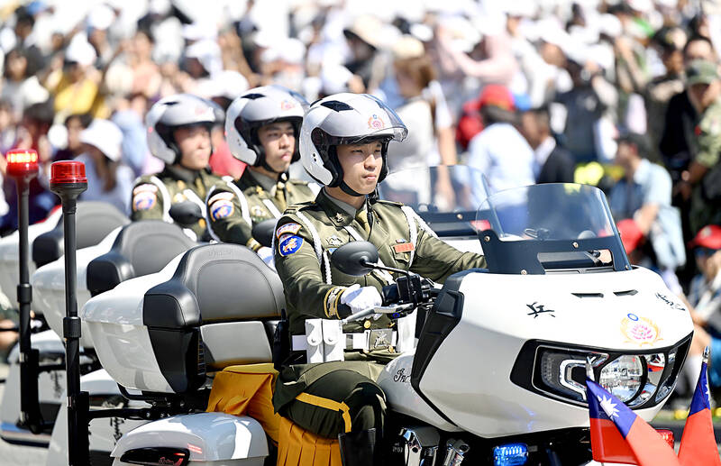Members of the Military Police Command’s Rapid Response Company ride motorcycles past the reviewing stand during the Double Ten National Day celebrations in front of the Presidential Office Building in Taipei yesterday.