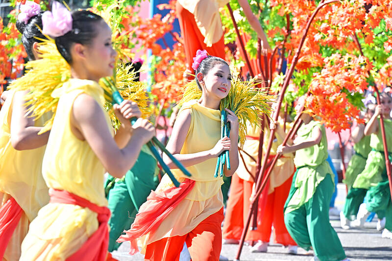 Students perform a traditional Hakka dance during the Double Ten National Day celebrations in front of the Presidential Office Building in Taipei yesterday.
