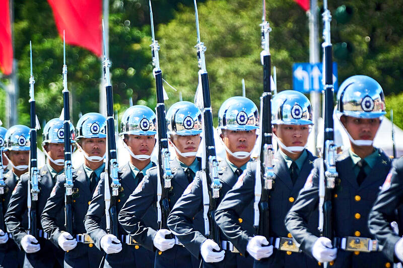 An honor guard stands at attention during the Double Ten National Day celebrations in front of the Presidential Office Building in Taipei yesterday.