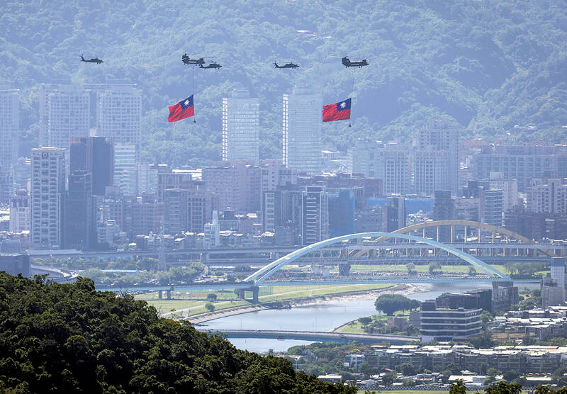 UH-60M Black Hawk helicopters carry giant Republic of China flags during a Double Ten National Day celebration in front of the Presidential Office Building in Taipei yesterday.