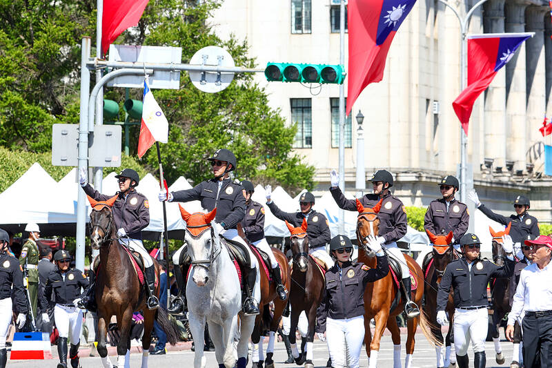 The New Taipei City Police Department’s Mounted Police Division march in front of the Presidential Office Building during the Double Ten National Day parade yesterday.